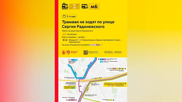 Москвичам рекомендуют пользоваться автобусом м6 вместо трамваев между метро "Авиамоторная" и храмом преподобного Сергия Радонежского. На шоссе Энтузиастов лучше пересесть на трамваи № 12, 37, 38, 46, добавили в пресс-службе.