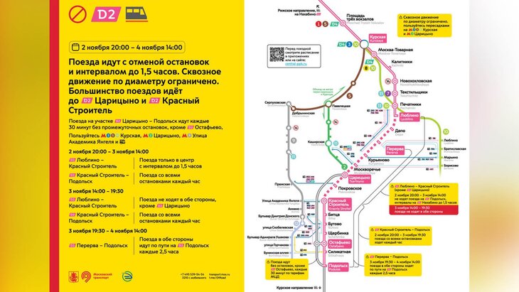 В частности, после 20:00 2 ноября до 14:00 3 ноября от станции Люблино до Красного Строителя не будет движения поездов на Подольск на станциях Депо, Перерва, Курьяново, Москворечье и Покровское.