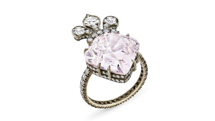 По просьбе покупателя камень получил новую оправу: его вставили в двойное кольцо, украшенное короной из 17 алмазов в форме монаршей лилии.
