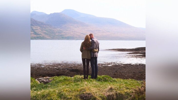 Супругов сфотографировали в объятиях у водоема на острове Малл в Шотландии. Старший сын короля Великобритании Карла III стоял в рубашке, пиджаке, синих брюках и туфлях, а его супруга была одета в жакет, джинсы и ботинки.