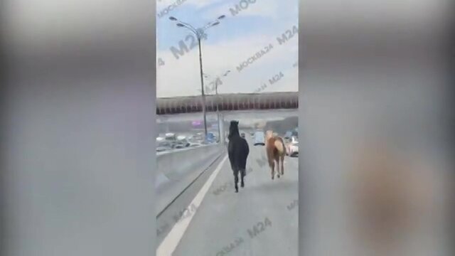 Две лошади выбежали на Московскую кольцевую автодорогу (МКАД). Очевидцы сняли происходящее на видеою.