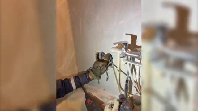 На видеокадрах видно, как специалисты просверлили дыру в стене ванной комнаты и извлекли животное.