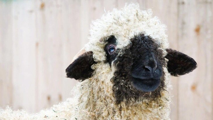 Ягненок является представителем породы валлийских овец. Они отличаются белой пушистой шерстью туловища, черной мордой и темными ногами.