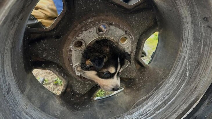 В штате Калифорния США пожарные вызволили щенка, голова которого застряла в колесном диске, сообщает UPI.