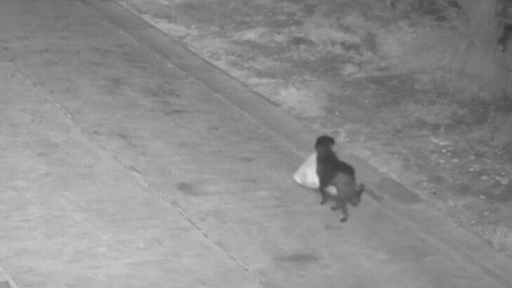 На кадрах собака тащит в зубах пакет с мусором и оставляет его на обочине. Ролики были засняты вечером 15 и 16 февраля.