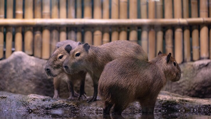 Три капибары – две самки и самец – поселились в "Москвариуме" 10 июля. В этот день праздновался День любви к капибарам. Для животных обустроили просторный биотопный вольер с двумя бассейнами и укрытиями.